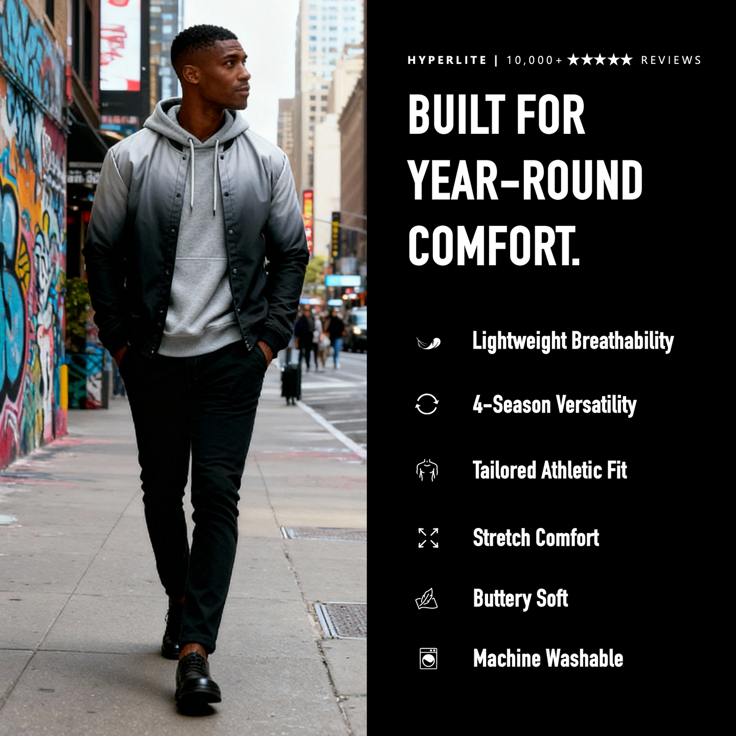 Our signature lightweight bombers feature our patented HYPERLITE fabric for maximum comfort and year-round versatility.